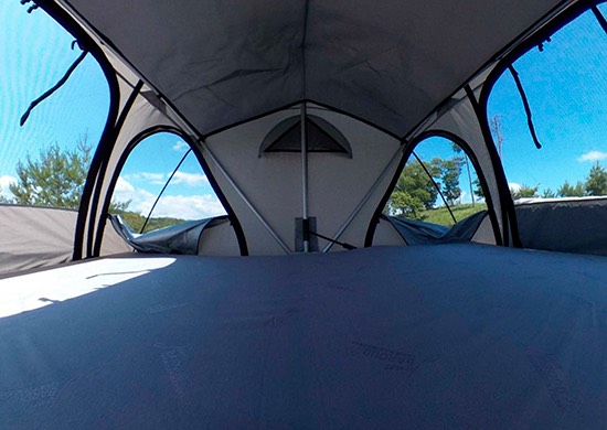 テント内から楽しめる360度(270度)ビュー!ジェームス・バロウドのルーフテントには大型の網戸付き窓が標準装備されています。風をたくさん取り入れることができるのはもちろん、満点の星空を見ながら眠りについたり、朝の気持ちの良い青空を見ながら目覚めることができます。